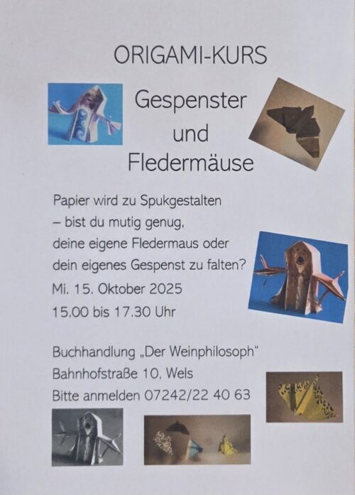 Am Mittwoch 15.10.2025 von 15:00 - 17:00 Uhr findet beim Weinphilosophen wieder ein schaurig schöner Origamikurs statt. Wir bitten um Anmeldung unter: 07242/22 40 63 Der WEINPHILOSOPH Bahnhofstraße 10 4600 Wels